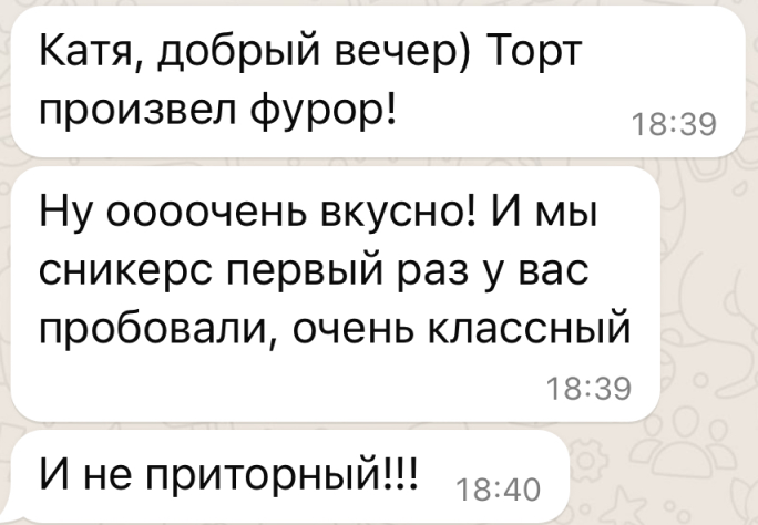 Катя, добрый вечер) Торт произвел фурор! Ну оооочень вкусно! И мы сникерс первый раз у вас пробовали, очень классный.
