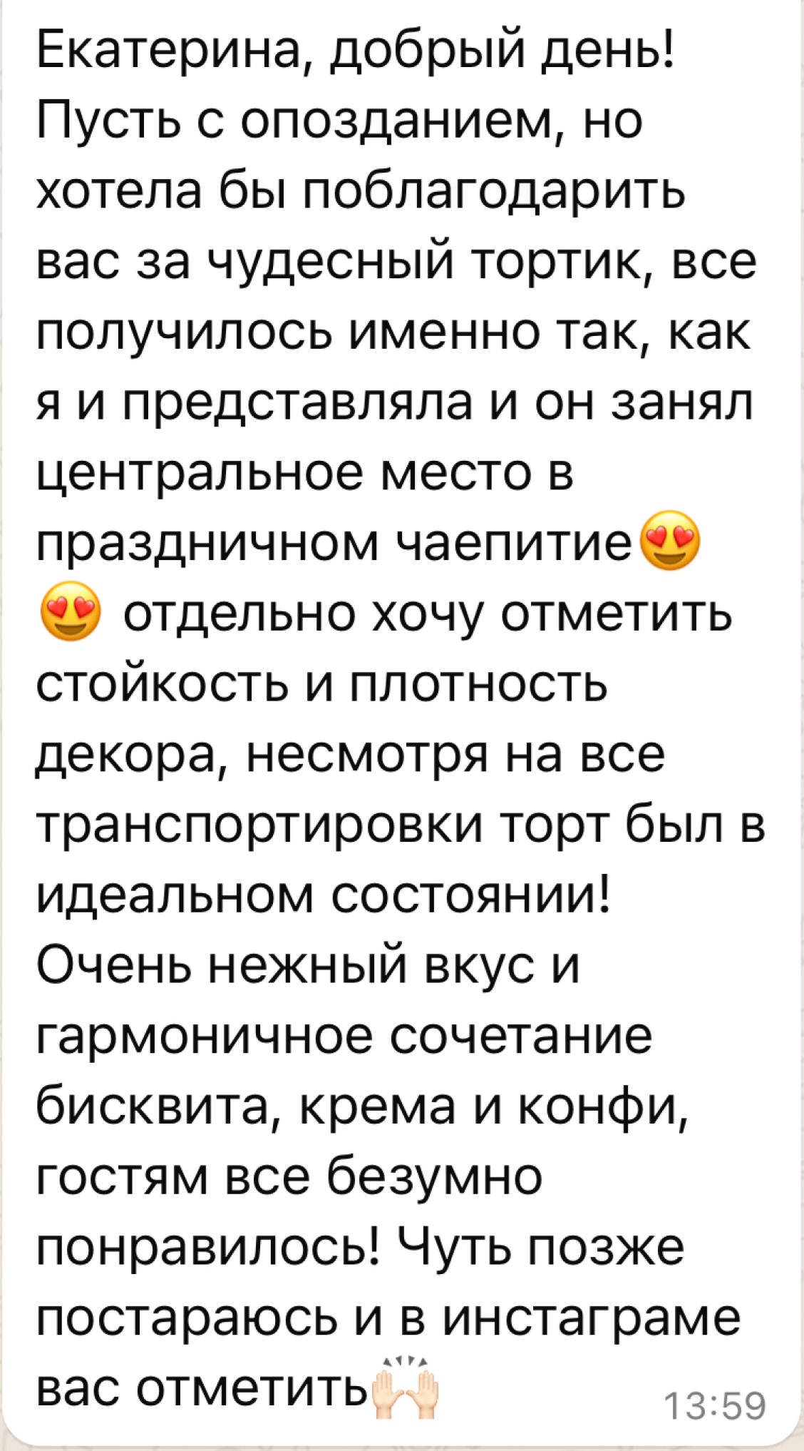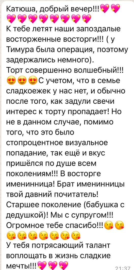 Катя, добрый вечер, хотела написать вам благодарность за торт! Уже после того, как он полностью съеден. Безумно вкусный, всем гостям очень понравилось!) Именинник в восторге от съедобных шахмат, а я от исполнения). Угодили всем и отдельное спасибо, за оперативное исполнение, в предновогоднюю суету.