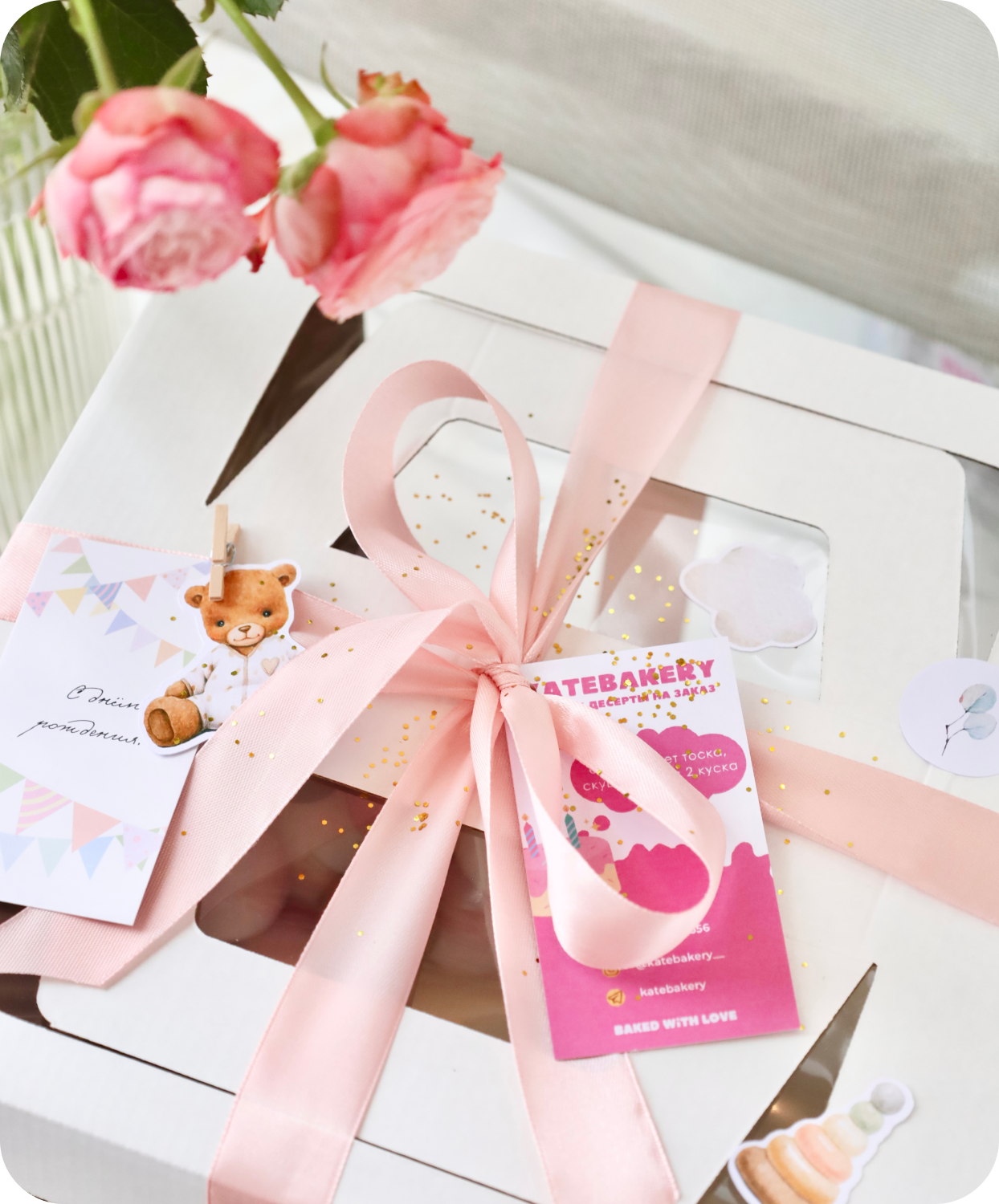 Каждый торт упаковывается в картонную коробку с окошками, а затем размещается в удобном пакете для комфортной транспортировки